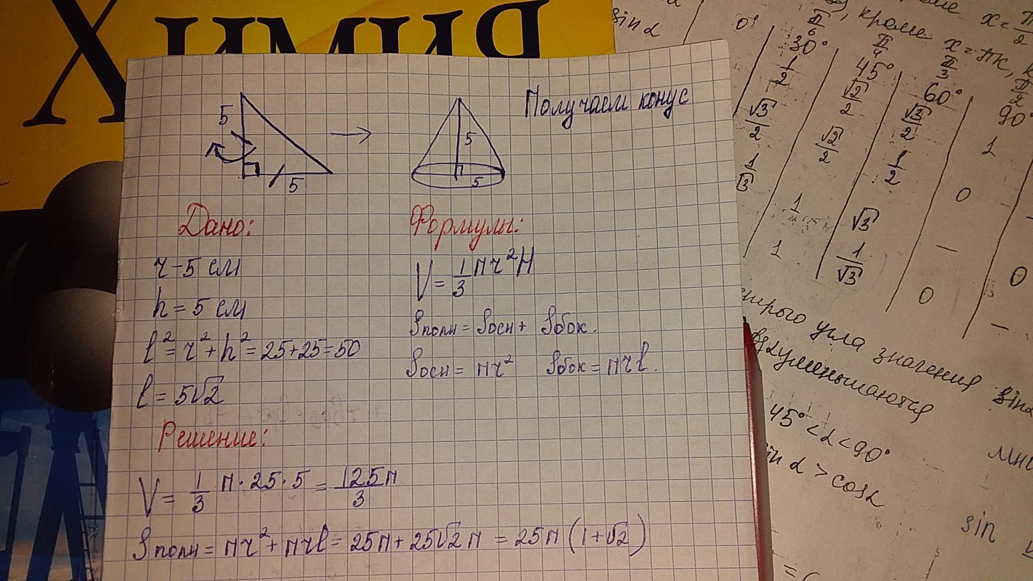 Прямоугольный равнобедренный треугольник с катетом 5 см, вращается вокруг катета. Найдите площадь полной поверхности и объем получившегося тела.
