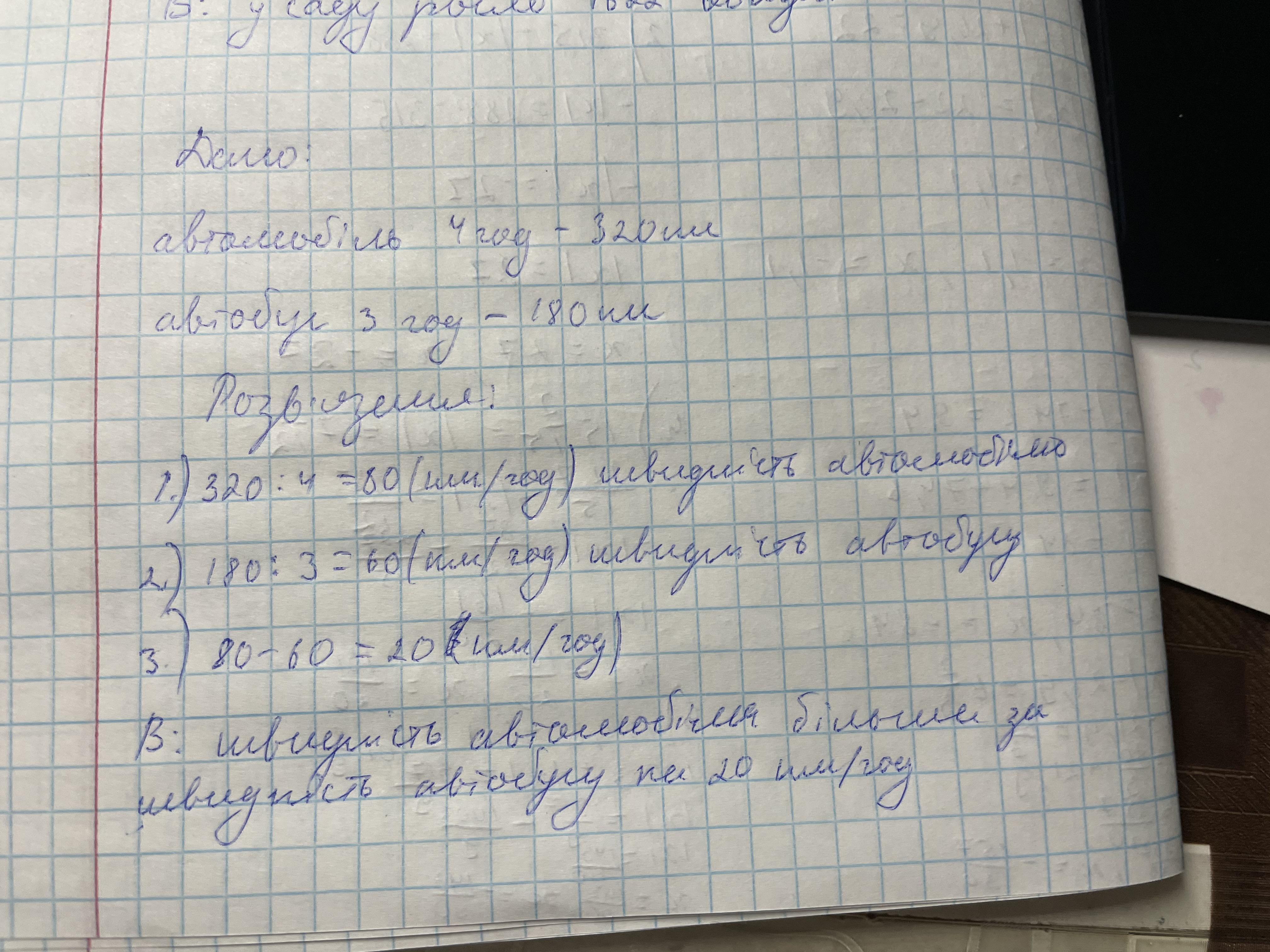 320 км, автобус 180 км На скільки швидкість автомобіля більша за