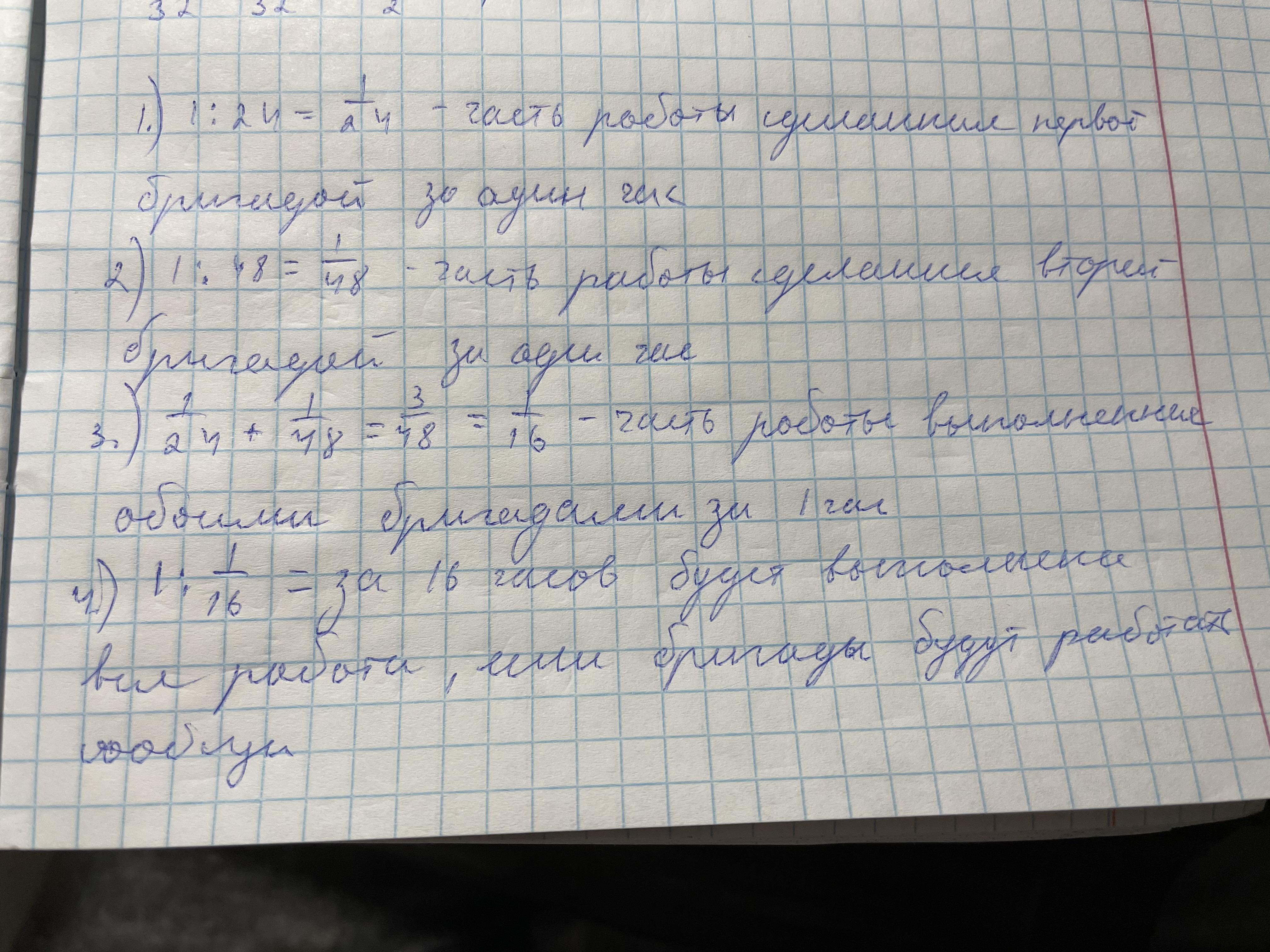 4. действие . Две бринады выполнят задание за 1:(1/16)=16 часов.