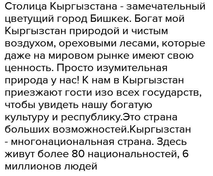Она известна небесными горами, пресной водой, бесконечными фруктовыми и ореховыми лесами, святынями, драгоценными камнями и плодородной почвой. Самое главное богатство Кыргызстана - его трудолюбивый народ.