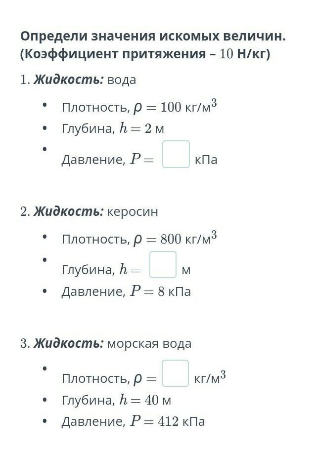 Определи значения искомых величин. (Коэффициент притяжения – 10 Н/кг)