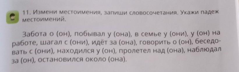 Забота о нем, побывал у нее, в семье у них, у него на работе, шагал с ними, идёт за ней, говорить о нем, беседовать с ними, находиться у него,пролететь над ней, наблюдать за ним, остановился около нее