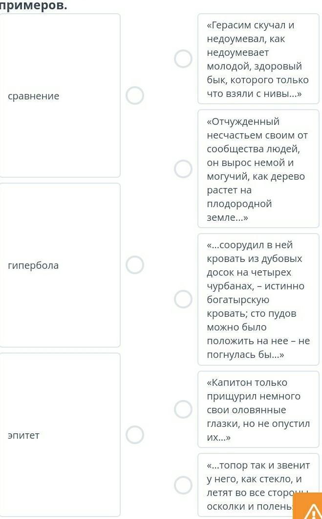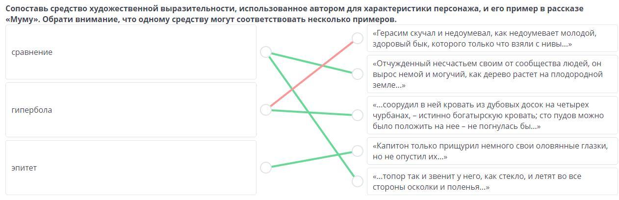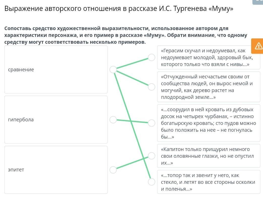 Сопоставь средство художественной выразительности, использованное автором для характеристики персонажа, и его пример в рассказе «Муму». Обрати внимание, что одному средству могут соответствовать несколько примеров.