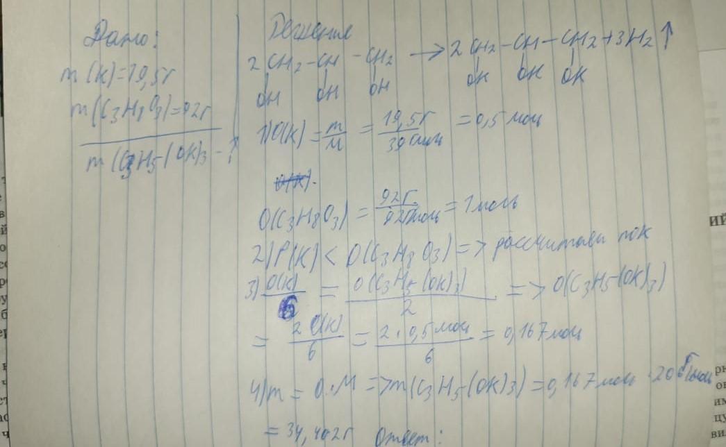 Рассчитайте массу глицерата калия, который образуется при взаимодействии калия массой 19,5 г с глицерином массой 92г.