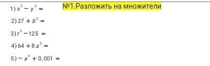 x^3-y^3=(x-y)(x^2+xy+y^2)\\\\27+b^3=(3+b)(9-3b+b^2)\\\\t^3-125=(t-5)(t^2+5t+25)\\\\64+8a^3=(4+2a)(16-8a+4a^2)\\\\-a^6+0,001=(0,1-a^2)(0,01+0,1a^2+a^4)