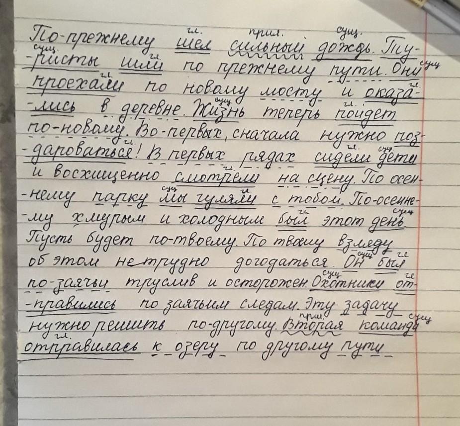 ( По) прежнему шел сильный дождь. Туристы шли ( по) прежнему пути. Они проехали ( по) новому мосту и оказались в деревне. Жизнь теперь пойдет (по) новому. (Во) первых, сначала нужно поздороваться! ( В ) первых рядах сидели дети и восхищенно смотрели на сцену. ( По) осеннему парку мы гуляли с тобой. ( По) осеннему хмурым и холодным был этот день. Пусть будет ( по ) твоему. (По) твоему взгляду об этом нетрудно догадаться. Он был (по)заячьи труслив и осторожен. Охотники отправились (по)заячьим следам. Эту задачу нужно решить ( по) другому. Вторая команда отправилась к озеру (по) другому пути.