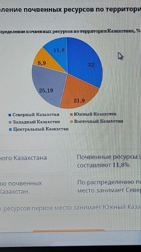 Используя диаграмму распределение почвенных ресурсов по территории Казахстана сделали вывод верных ответов три почвенные ресурсы Центрального Казахстана составляет 8,9%, По распределению почвенных русурсов первое место занимает Южный Казахстана составляют 11,8. Второе место по распределению почвенных русурсов занимает Северный Казахстан. По распределению почвенных русурсов первое место занимает Северный Казахстан.