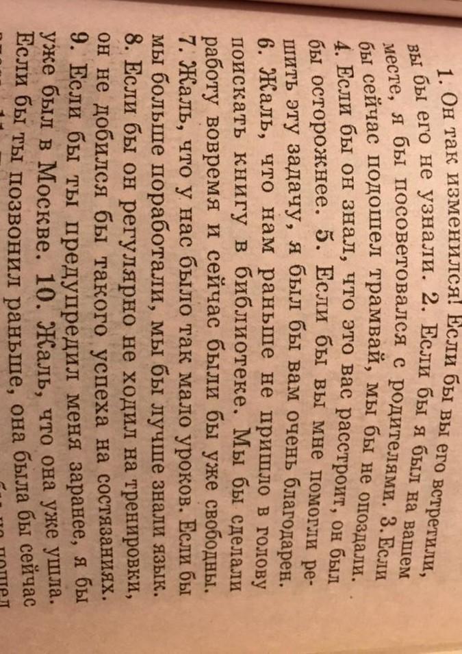 1. He has changed so much. If you met him, you would not recognize him. 2. If I were in your place, I would consult with my parents. 3. If a tram came up now, we would not be late. If he knew it would upset you, he would be more careful. 5. If you helped me to solve this problem, I would be very grateful to you. 6. It is a pity that it did not occur to us earlier to look for a book in the library. We would have done the job on time and would be free now. 7. It is a pity that we had so few lessons. If we worked harder, we would know the language better. 8. If he did not regularly go to training, he would not have achieved such success in competitions. 9. If you had warned me in advance, I would have already been in Moscow.