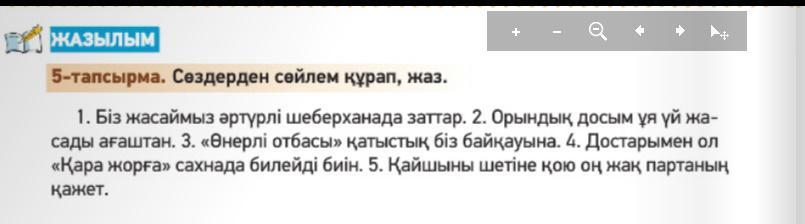 1. Біз шеберханада әртүрлі заттар жасаймыз. 2 .Досым ағаштан ұя,үй,орындық жасады. 3. Біз "Өнерлі отбасы" байқауына қатыстық. 4. Сахнада достарымен "Қара жорға" ол биін билейді. 5. Қайшыны оң жақ партаның шетіне қою қажет.