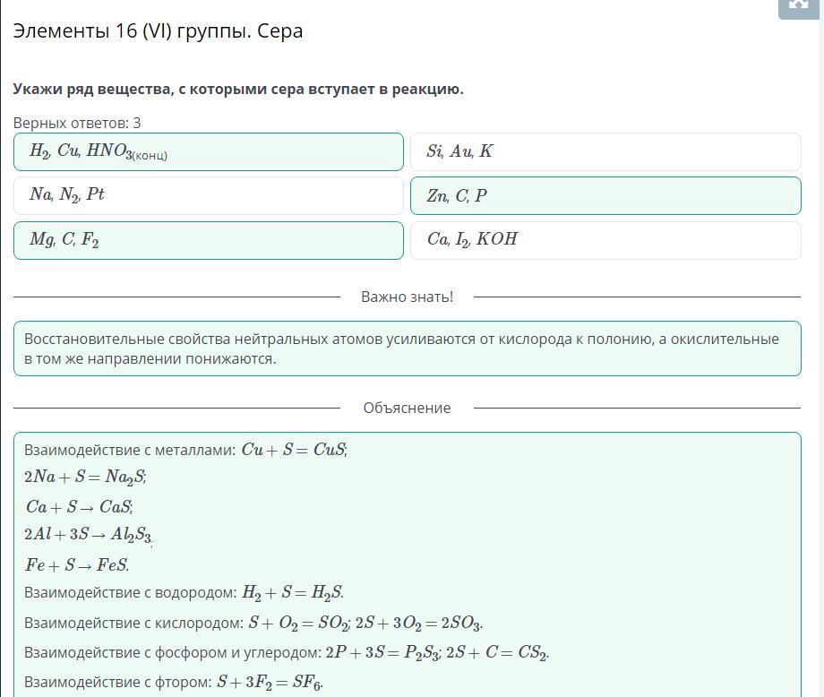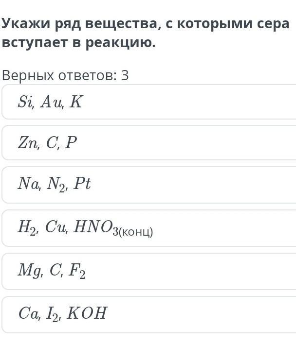 Укажи ряд вещества, с которыми сера вступает в реакцию.