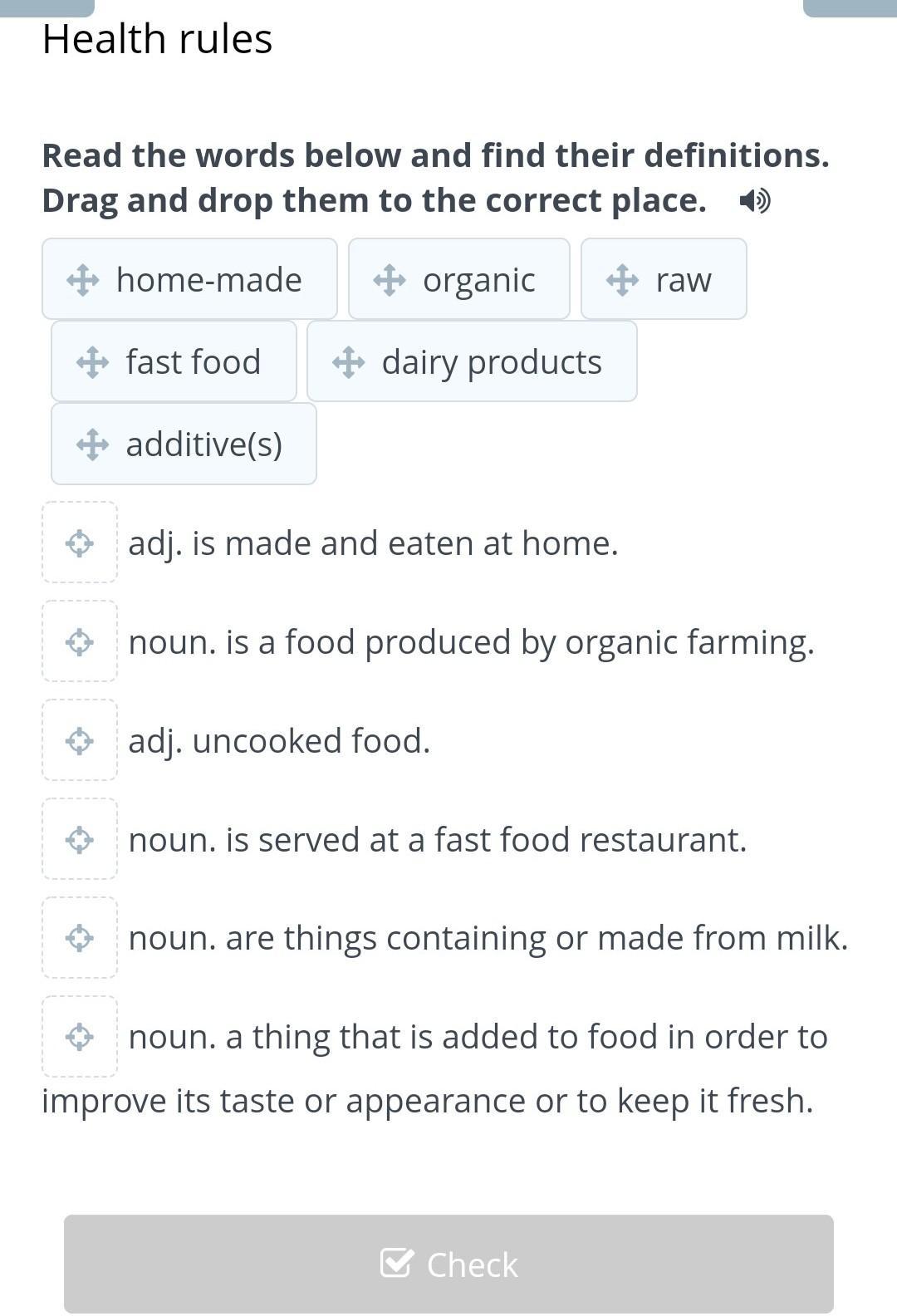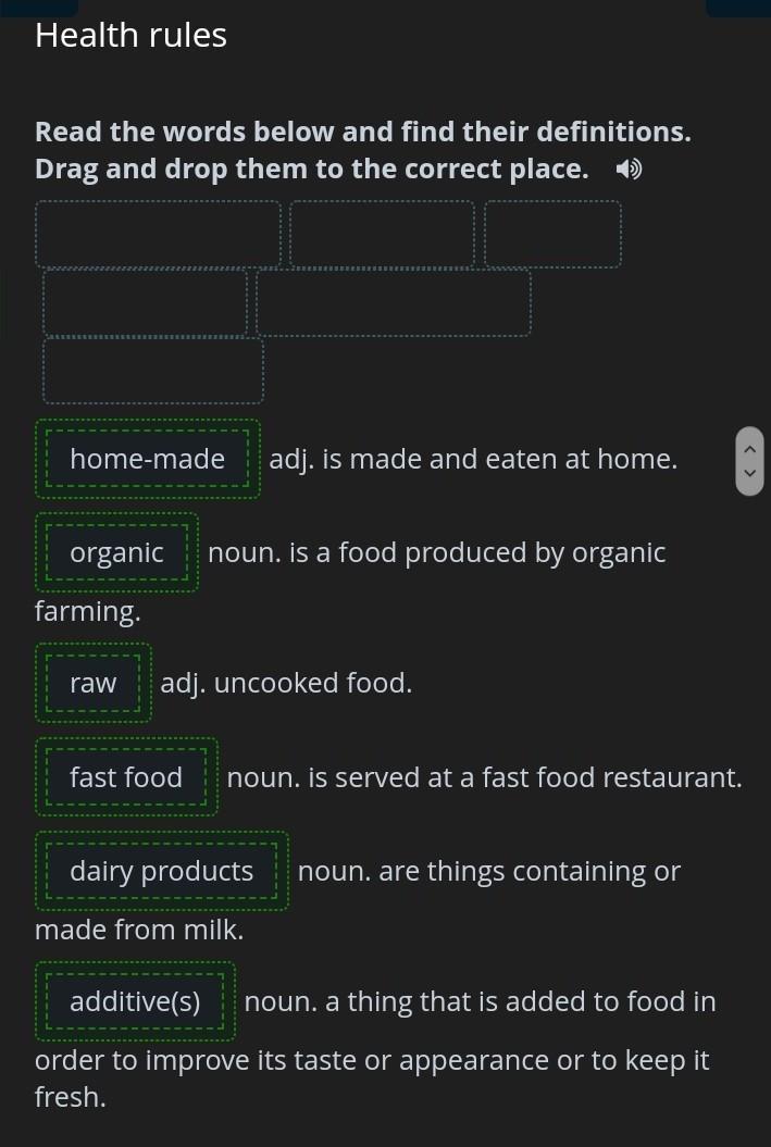 read the words below and find their definitions.Drag and drop them to the correct place