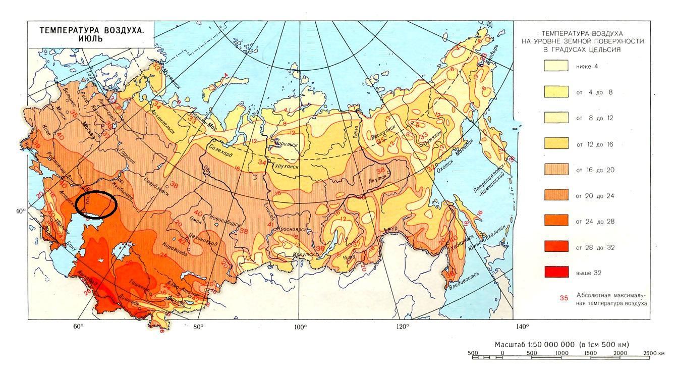 Как видно из карты температур июля, которая дана ниже в приложении, наибольшая температура будет в Прикаспийской низменности, которая расположена на юге нашей страны.