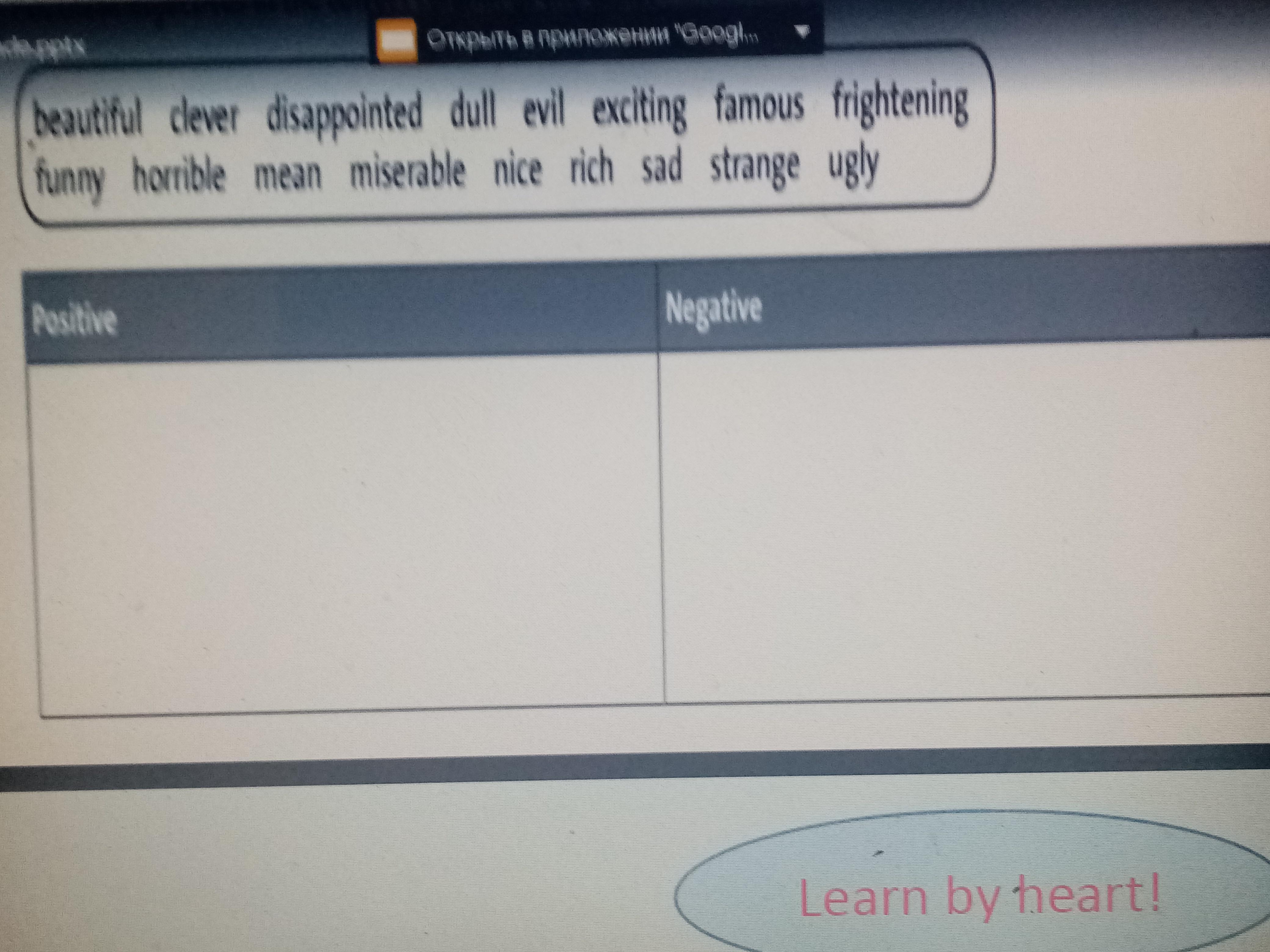 positive: beautiful,clever,exciting,famous,funny,nice,rich