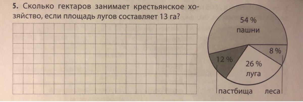 если крестьянское хозяйство это пашни и пастбища, то 13га:26%=0,5 га на 1%, (54+12)*0,5=33га