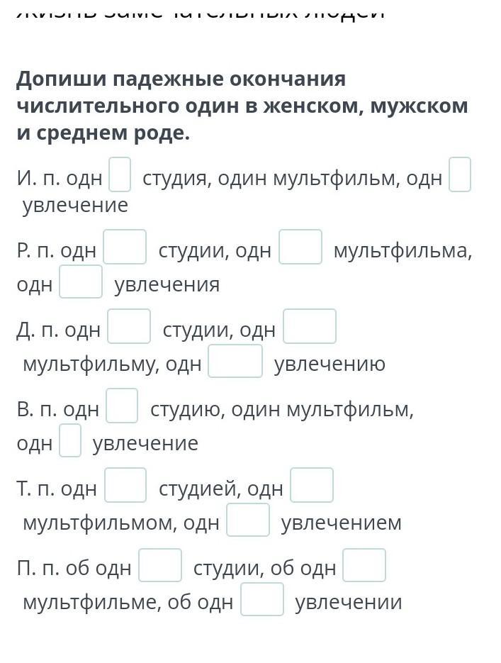 Допиши падежные окончания числительного один в женском, мужском и среднем роде.