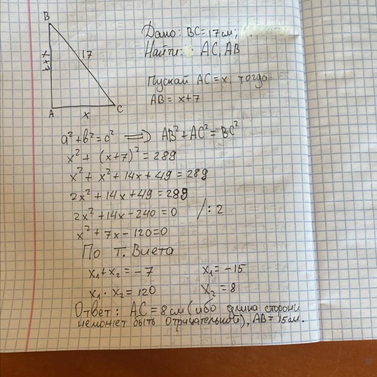 Знайти катети прямокутного трикутника,якщо один з них на 7 см більший,ніж інший,а гіпотенуза дорівнює 17 см.