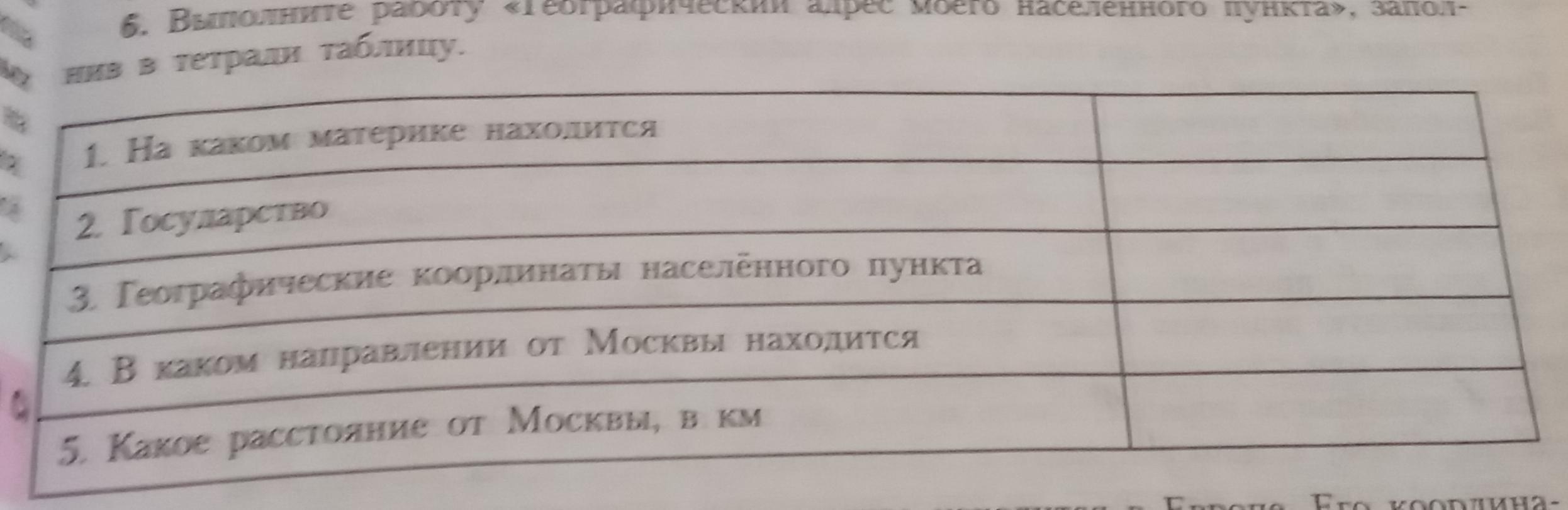 Выполните работу географический адрес моего населенного пункта заполнив в тетради таблицу