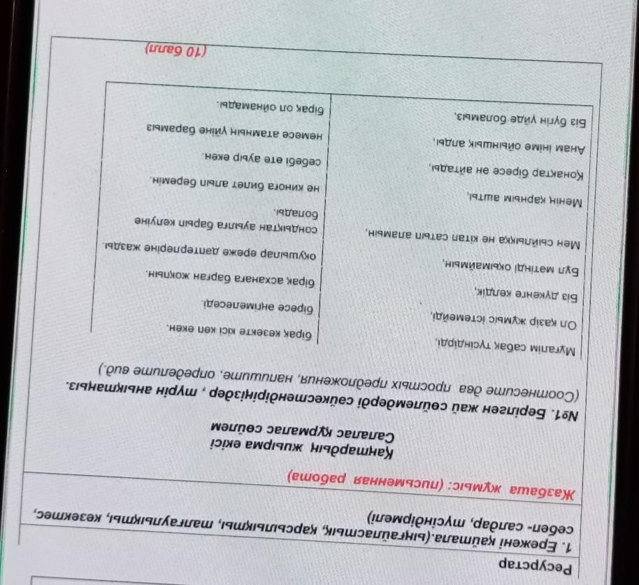 Ответ: 1. мұғалім сабақ түсіндірді оқушылар ереже дәптерлеріне жазды.2. Ол қазір жұмыс істемейді сондықтан ауылға барып келуіне болады.3. Біз дүкенге келдік бірақ кезекте кісі көп екен.4.Бұл мәтінді оқымаймын себебі өте ауыр екен.5. Мен сыйлыққа не кітап сатып аламын не киноға билет алып беремін.6.Менің қарным ашты бірақ асханаға барған жоқпын.7.Қонақтар біресе ән айтады біресе әңгімелеседі.8.Анам ініме ойыншық алды бірақ ол ойнамайды.9.Біз бүгін үйде боламыз немесе атамның үйіне барамыз.