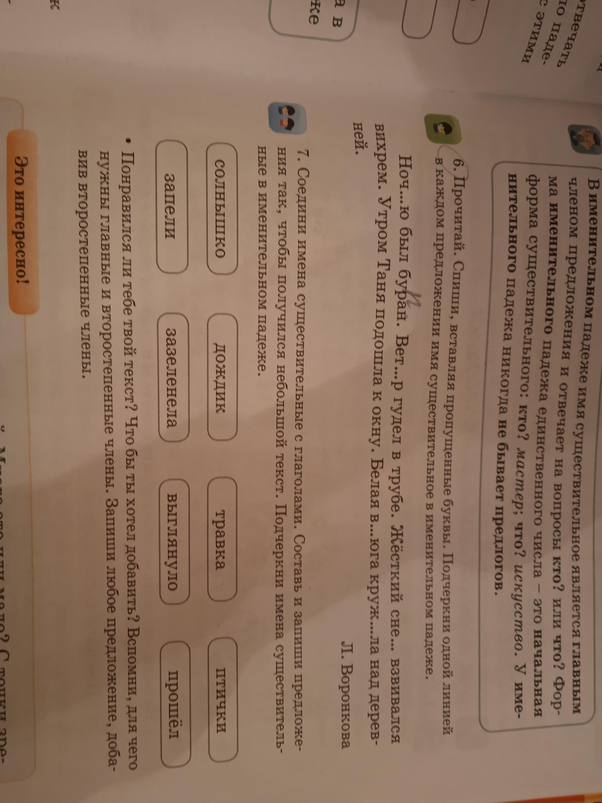 Ответ:Ночью был буран. Ветер гуделв трубе. Жёсткий снег (или я незнаю) взвивался вихреи. Утром Таня подошла к окну. Белая вьюга кружила над деревней. ( именительные падежи смотрите в Объяснение)