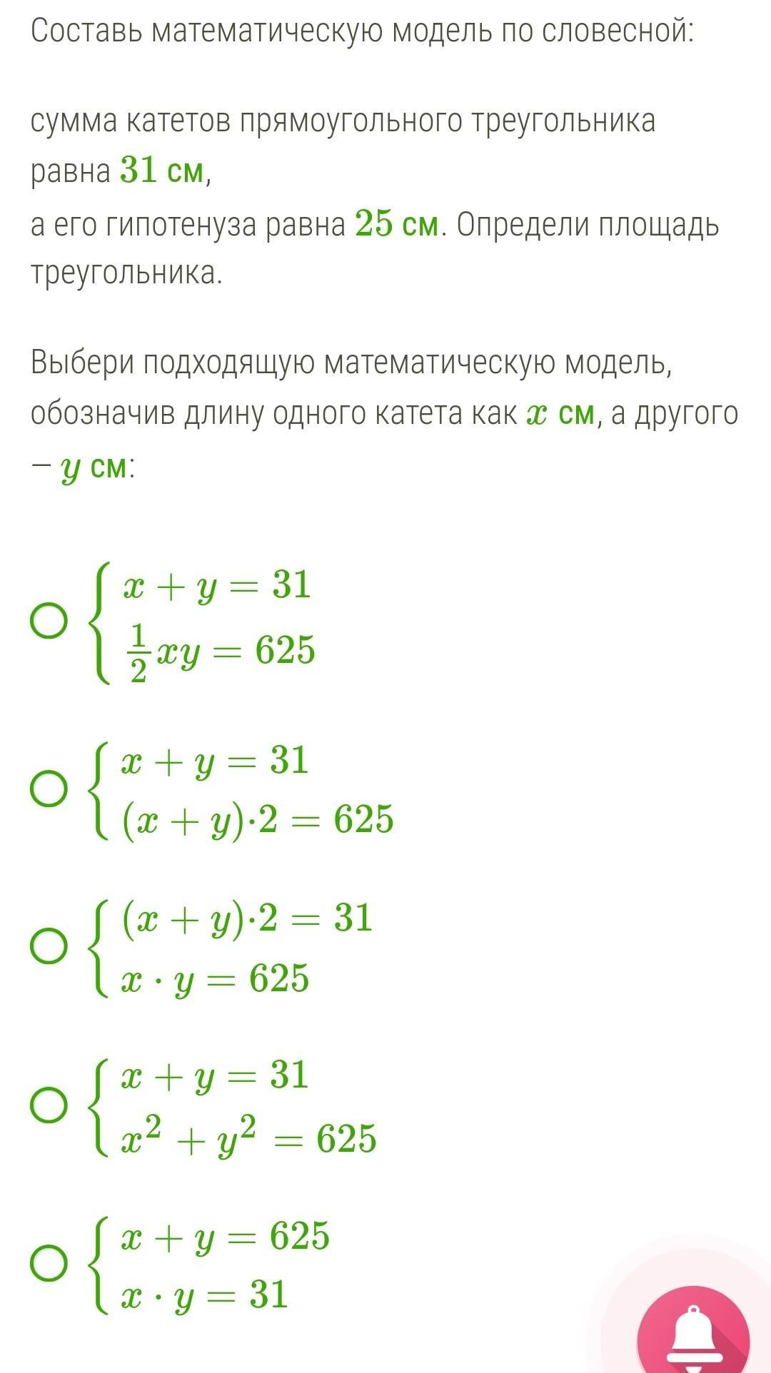 первое уравнение из условия, что сумма катетов х и у равна 31