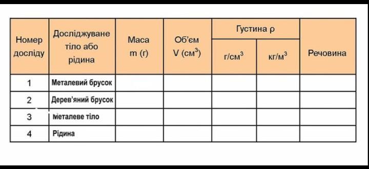 допоможіть лабораторна робота з фізики Визначення густини твердих тіл і рідин 7(7 клас) подробніше на фото даю 100 балів.