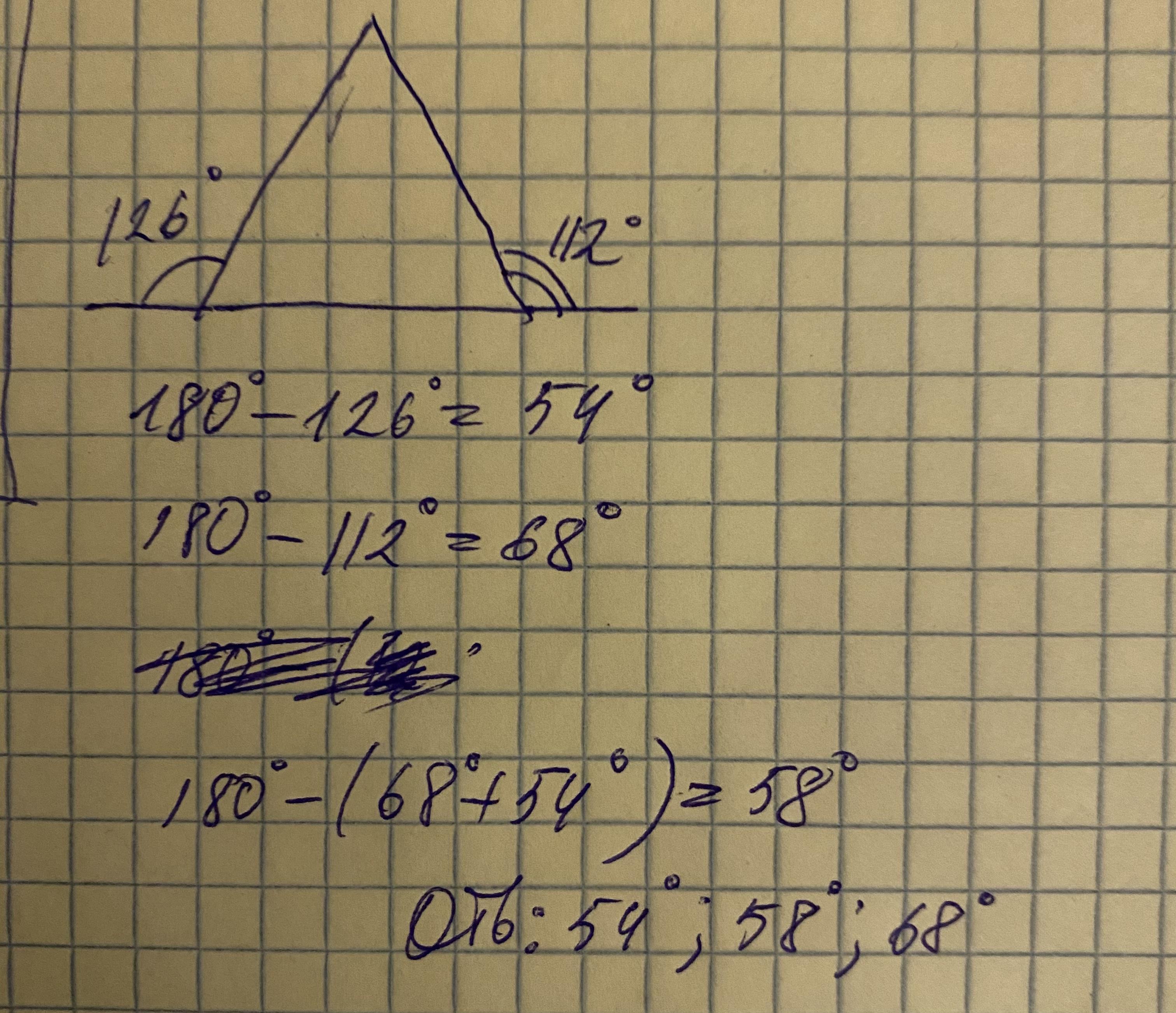 Два внешних угла треугольника равны 126 градусов и 112 градусов. Найдите углы треугольника.
