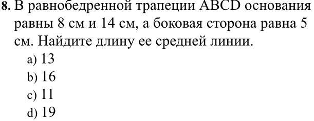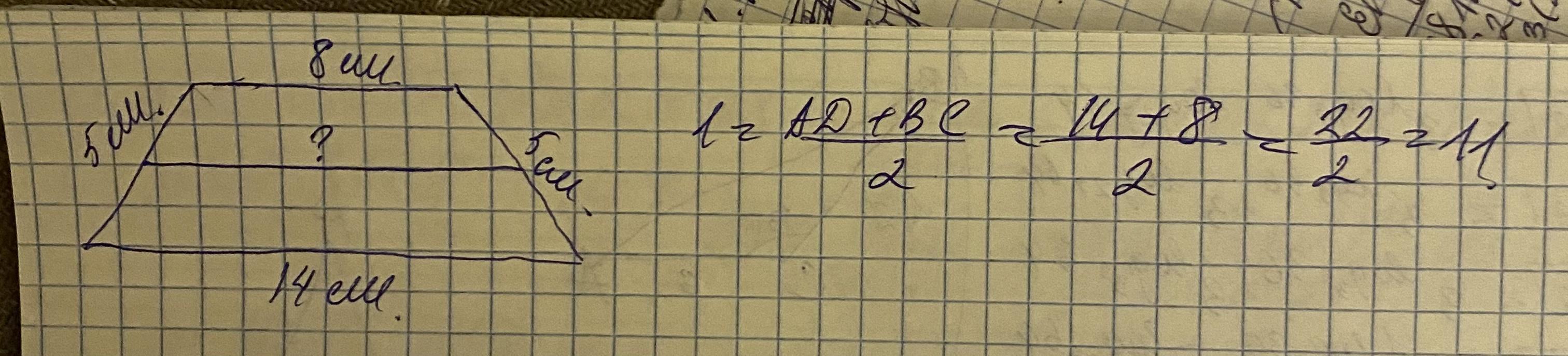 В равнобедренной трапеции ABCD основания равны 8 и 14см, а боковая сторона равна 5см. Найдите длину ее средней линии.