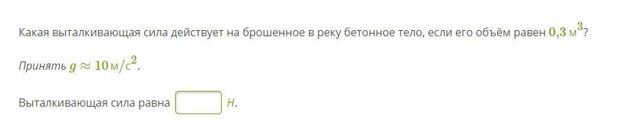 Какая выталкивающая сила действует на брошенное в реку бетонное тело, если его объём равен 0,3 м3?
