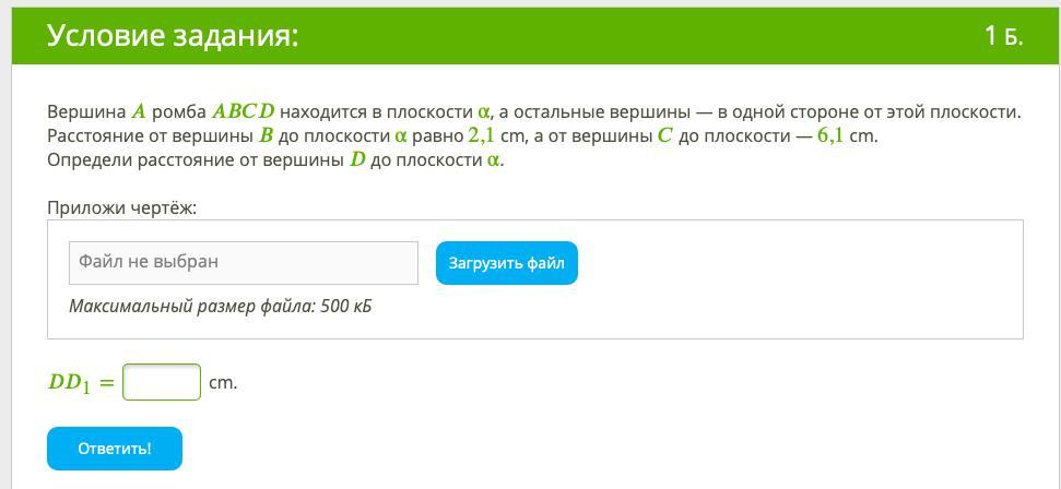 Вершина ромба находится в плоскости α, а остальные вершины — в одной стороне от этой плоскости. Расстояние от вершины до плоскости α равно 2,1 cm, а от вершины до плоскости — 6,1 cm. Определи расстояние от вершины до плоскости α.
