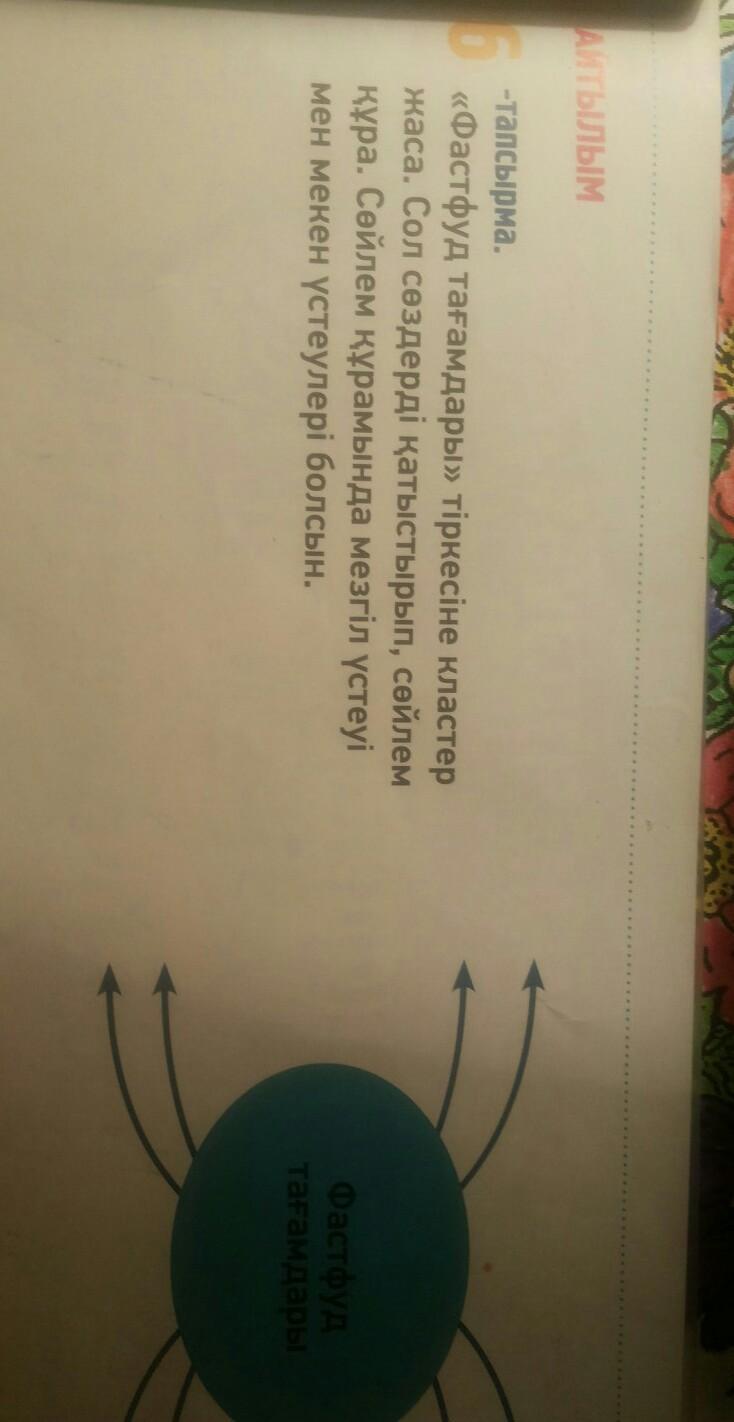 «Фастфуд тағамдары» тіркесіне кластер жаса.Сол сөздерді қатыстырып, сөйлем құра.Сөйлем құрамында мезгіл үстеуі мен мекен үстеулері болсын.