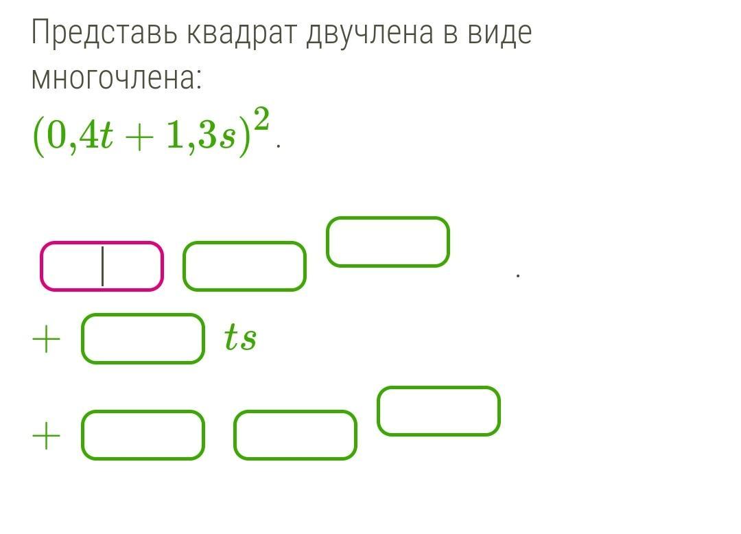 1) (0,4t + 1,3s)² = 0,16t² + 0,84ts + 1,69s²