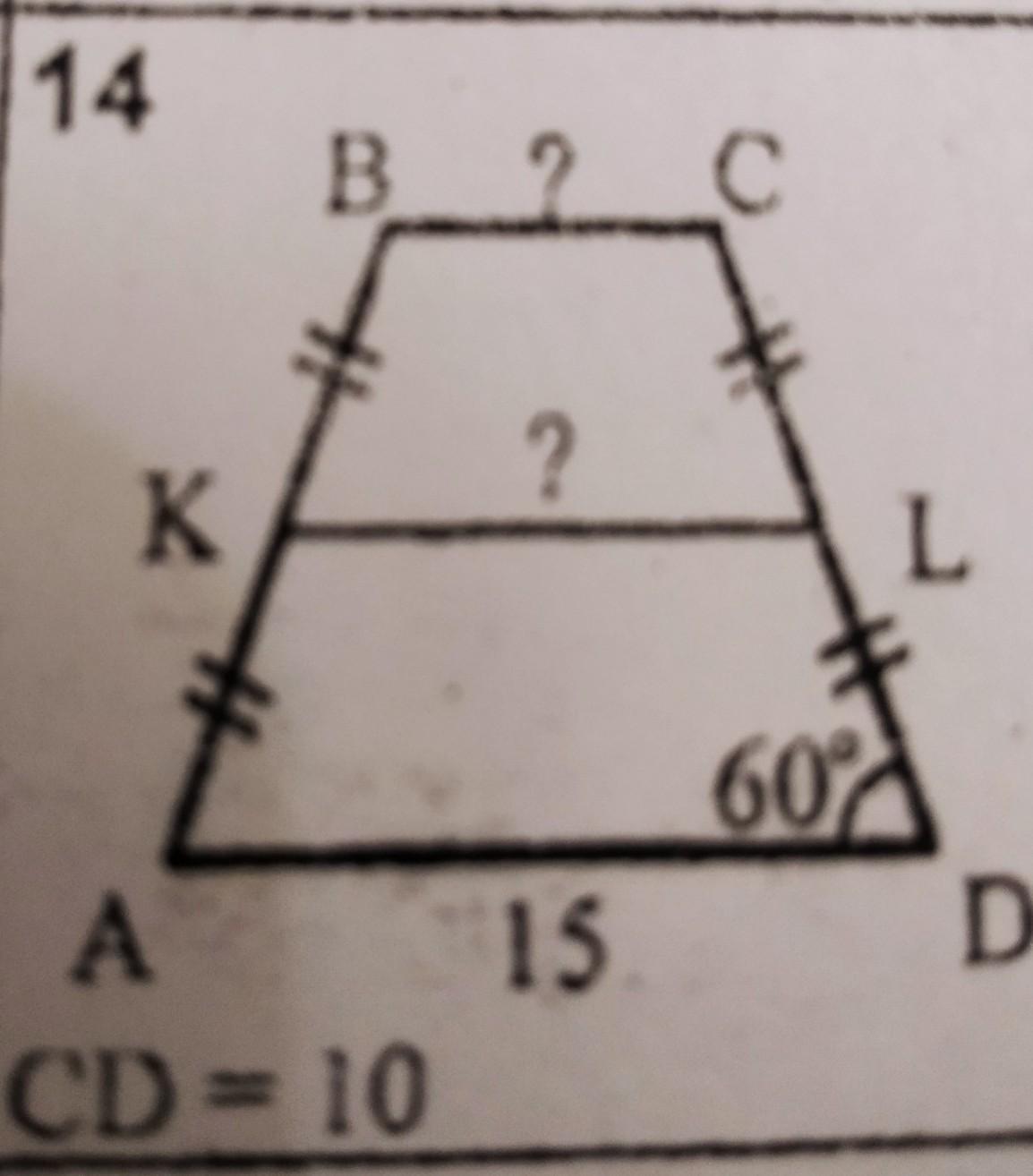проведём высоту CH. HD=cos60*CD=1/2*10=5. BC=AD-2*HD=15-5*2=5. KL=(BC+AD)/2=10