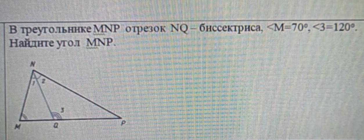 в треугольнике MNP отрезок NQ биссектриса, угол M=70°, угол 3=120°. Найдите угол MNP