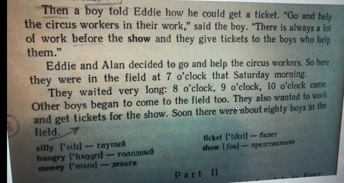 Ответ:Тогда малчьик сказал Эдди как он может получить билет."Иди к работникам цирка и помоги им с их работой",сказал мальчик."там всегда много людей работающие перед выступлением и они дают билеты мальчишкам которые им помогают".