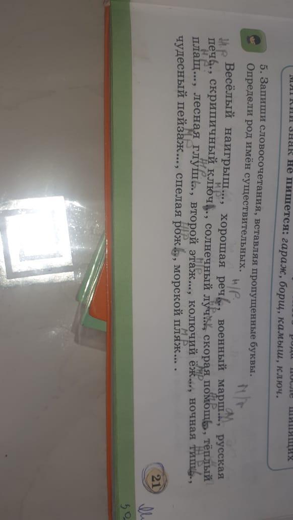Весёлый наигрыш(м.р.), хорошая речЬ(ж.р.), военный марш(м.р.), русская печЬ(ж.р.), скрипичный ключ(м.р.), солнечный луч(м.р.), скорая помощЬ(ж.р.), тёплый плащ(м.р.), лесная глушЬ(ж.р.), второй этаж(м.р.), колючий ёж(м.р.), ночная тишЬ(ж.р.), чудесный пейзаж(м.р.), спелая рожЬ(ж.р.), морской пляж(м.р.).