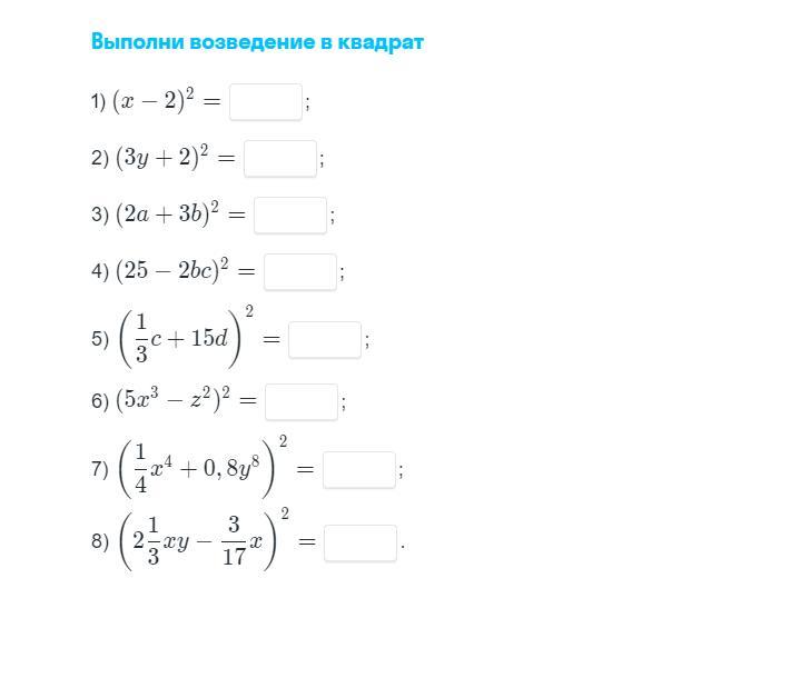 8) (2 1/3xy - 3/17x)² = 49/9x²y² - 14/17x²y + 9/289x².