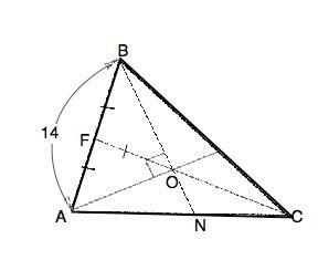 медианы ad и bn треугольника abc перпендикулярны. Найдите медиану CF,если AB=14