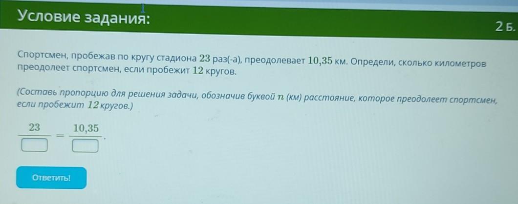 Раз 23 круга = 10,35 км, то 12 кругов = х км