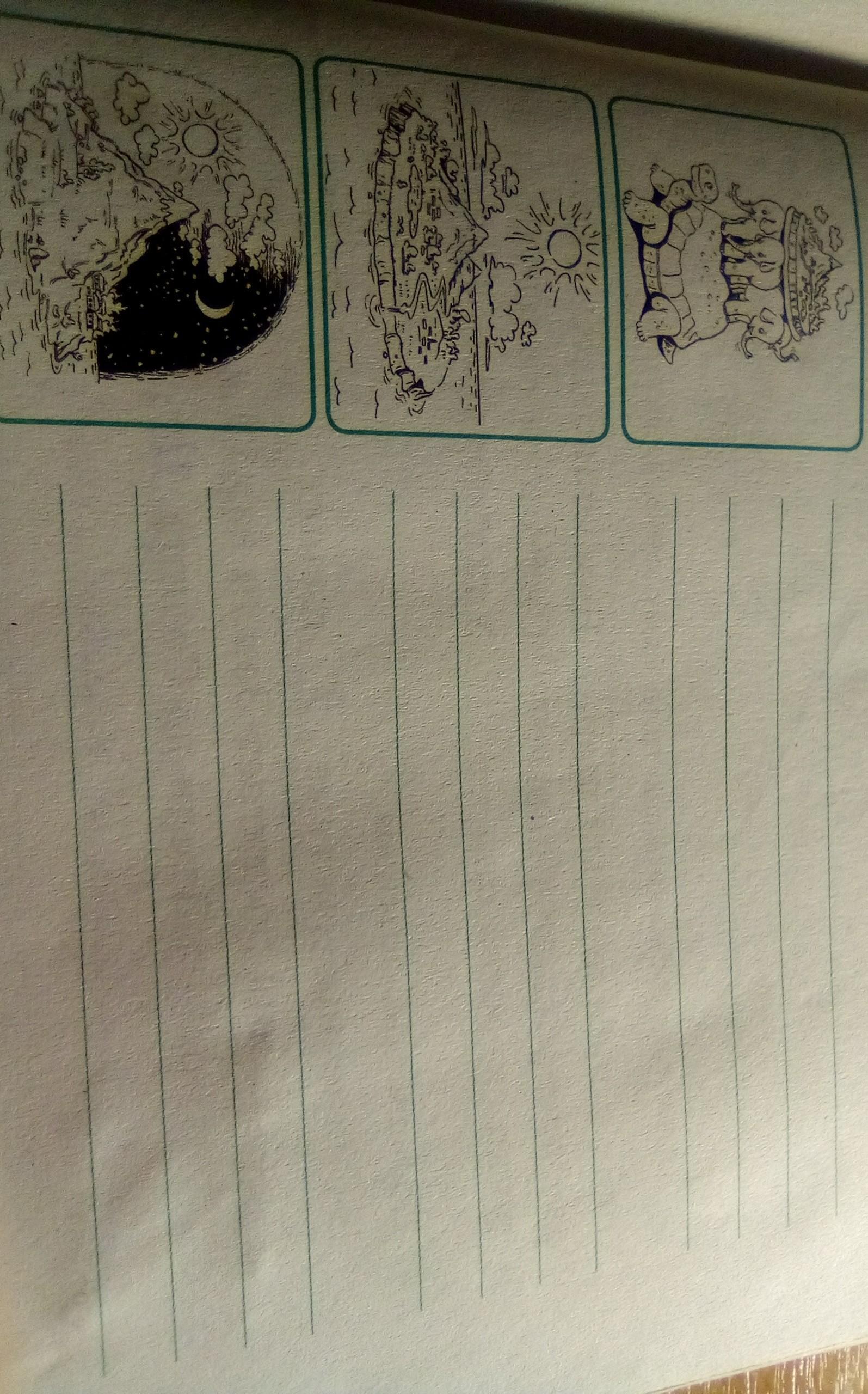 плоская земля которая держится на трех слонах которые стоят на черепахе. Вокруг плоской земли бесконечное море у которого нет конца. Земля покрыта куполом который удерживает на земле воздух
