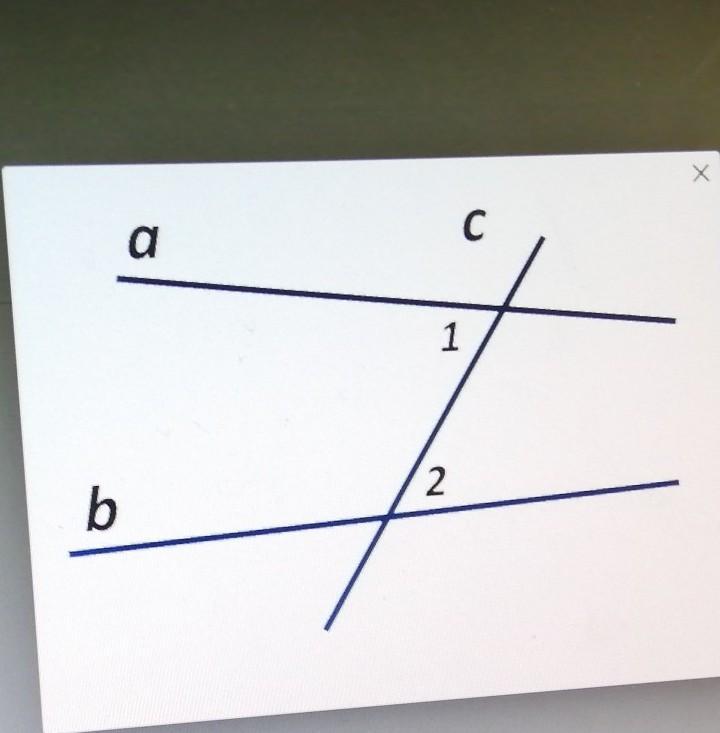 на рисунке прямые a и b пересечены прямой c; ∠1 и ∠2 внутренние накрест лежащие углы; ∠1 = 67°; ∠2 = 55°.