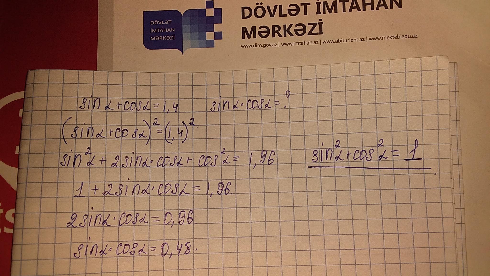 если sin a + cos a = 1,4; найдите значение выражения sin a * cos a=