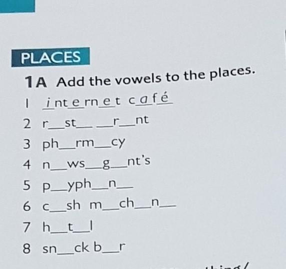 PLACES 1A Add the vowels to the places. | inte rn et café 2 r_st_r_nt 3 ph_rm_cy 4 n_ws_g_nt's 5 P_yph_n 6 c_sh m_ch_n_ 7 h_t_ 8 sn_ck b__r