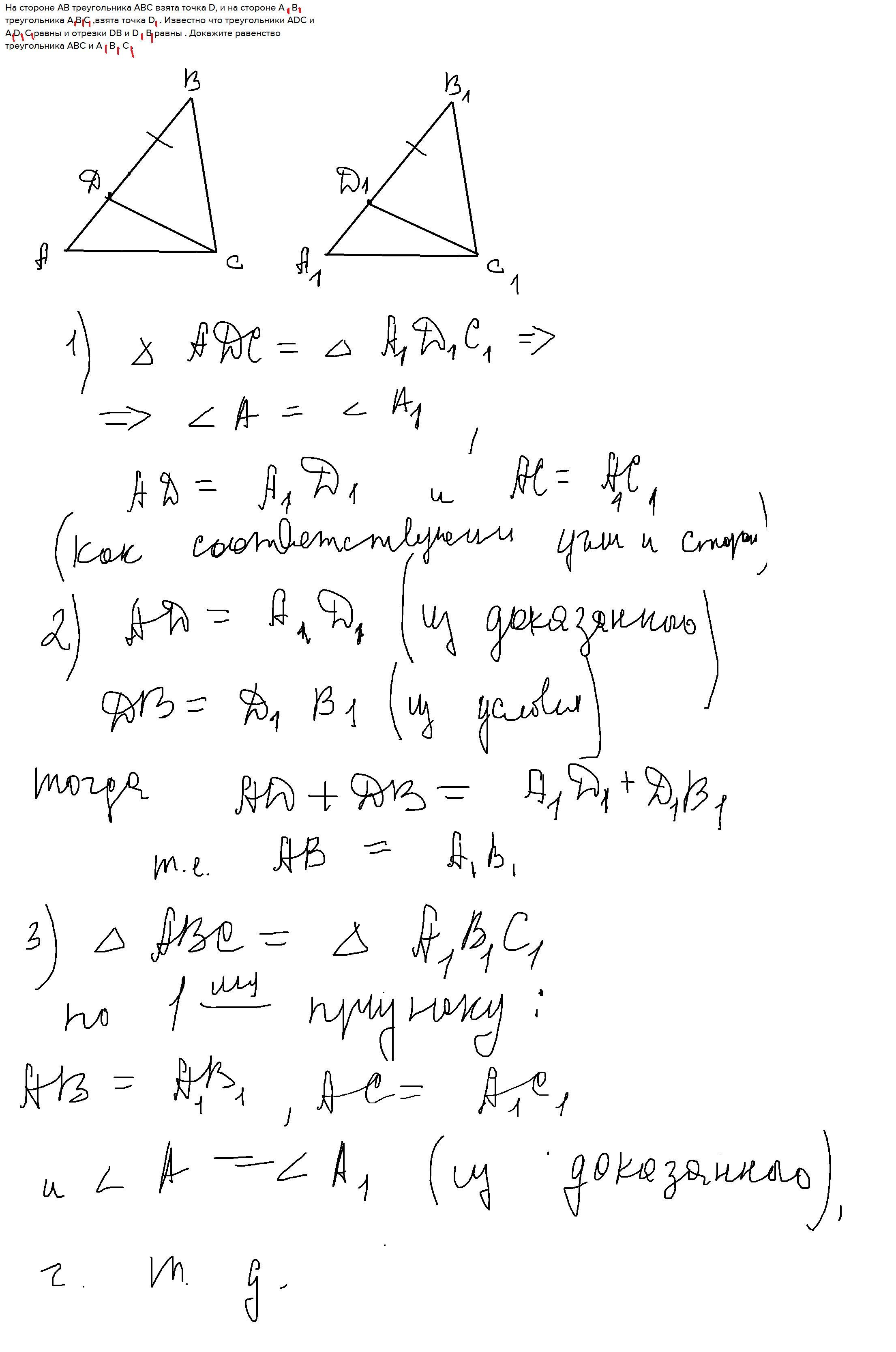 На стороне АВ треугольника АВС взята точка D, и на стороне А , В треугольника А,В,С ,взята точка D, . Известно что треугольники АDС и А,D, С равны и отрезки DВ и D , В равны . Докажите равенство треугольника АВС и А , В , С .