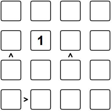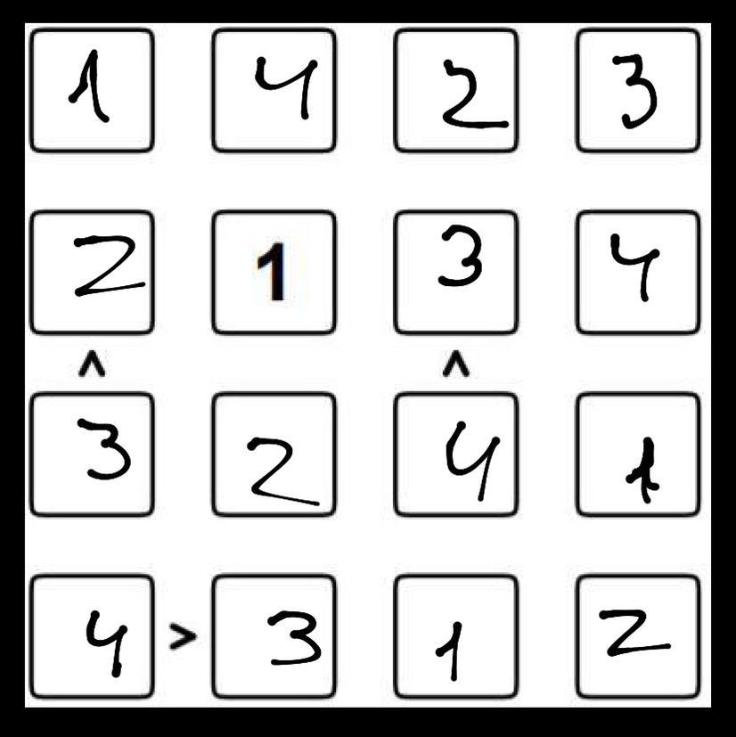 Заполните клетки числами 1 2 3 4 , учитывая знаки неравенства так, чтобы в каждой строке и в каждом столбце каждое число было записано один раз. Какое число будет записано в верхней строке в угловой клетке справа?