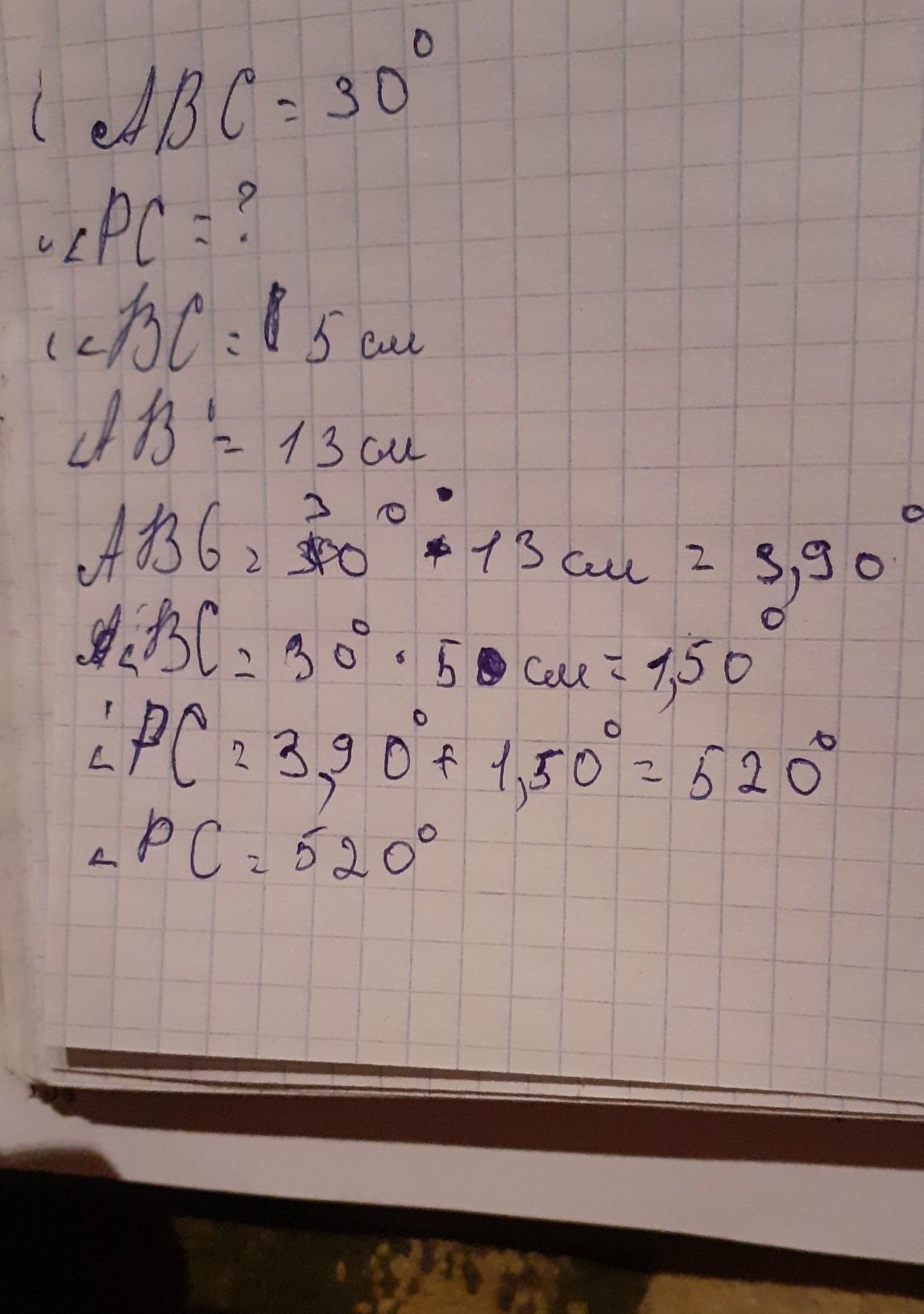PA — перпендикуляр до площини трикутника ABC, PC ⊥ BC. Знайдіть відстань від точки P до площини трикутника, якщо AB = 13 см, BC = 5 см, а пряма PC утворює з площиною трикутника кут 30°. Відповідь округліть до сотих.