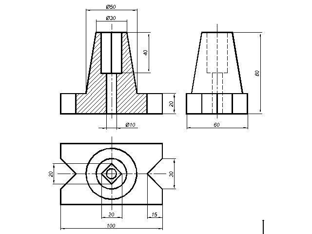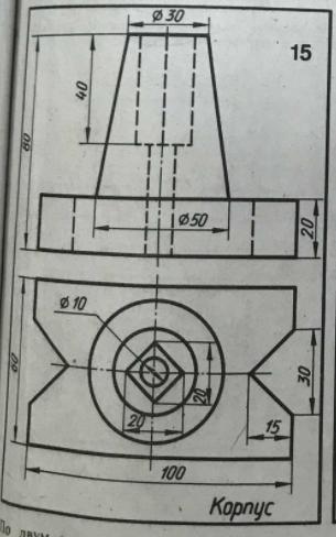 По двум видам детали выполнить третий. Выполнить разрезы. Проставить размеры. Изобразить деталь в изометрии с вырезом четверти