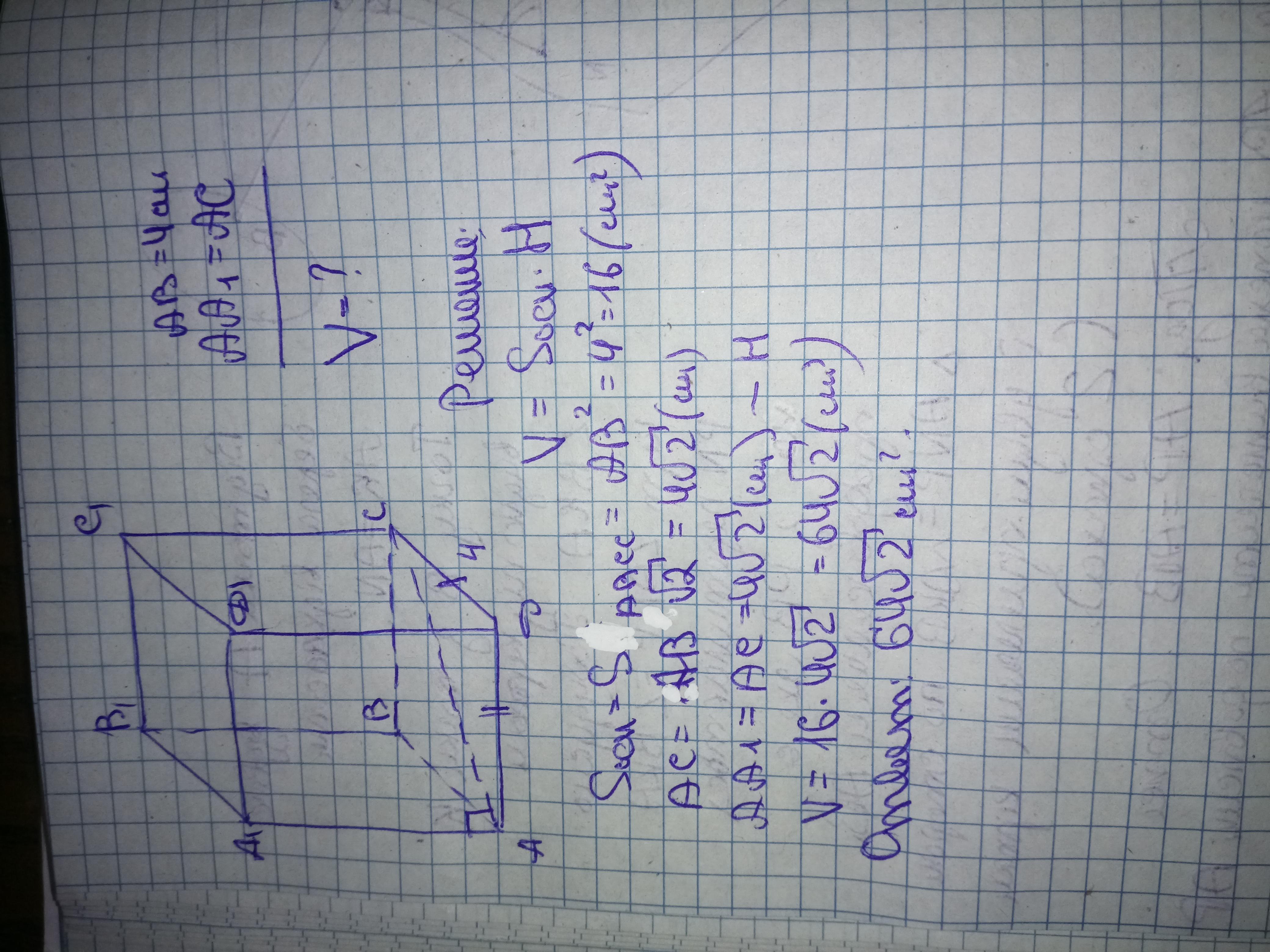 Дана правильная четырехугольная призма, сторона основания равна 4см, а высота равна диагонали основания призмы. Найдите объем призмы.