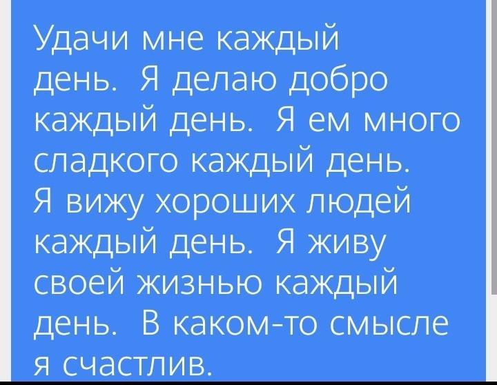 Мені күнде бір сәттілік күтүп тұрады. Мен күнде жақсылық жасаймын. Мен күнде көп тәттілер жеймін. Мен күнде жақсы адамдарды көремін. Мен күнде өзімнің тәртібіммен тұрамын. Былайша айтқанда мен бақытты ын.