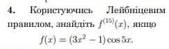 Пусть u(x) и v(x) - дифференцируемые функции от x. По правилу Лейбница, [u*v](n)=C(n,k)*u(n-k)*v(k), где C(n,k) - число сочетаний из n по k. В нашем случае u=3*x²-1 и v=cos(5*x), поэтому u(3)=u(4)=...=u(15)=0, и тогда [u*v](15)=C(15,13)*u"*v(13)+C(15,14)*u'*v(14)+C(15,15)*u*v(15). Но u'=6*x, u"=6, C(15,13)=105, C(15,14)=15, C(15,15)=1. Используем рекуррентную формулу для cos(m*x): [cos(m*x)](n)=m^n*cos(m*x+π*n/2). В нашем случае m=5, n=13,14,15. Тогда [cos(5*x)](13)=5^13*cos(5*x+13*π/2)=-5^13*sin(5*x), [cos(5*x)](14)=5^14*cos(5*x+14*π/2)=-5^14*cos(5*x), [cos(5*x)](15)=5^15*cos(5*x+15*π/2)=5^15*sin(5*x). Отсюда [u*v](15)=105*6*[-5^13*sin(5*x)]+15*6*x*[-5^14*cos(5*x)]+1*(3*x²-1)*5^15*sin(5*x)=630*[-5^13*sin(5*x)]+90*x*[-5^14*cos(5*x)]+(3*x²-1)*5^15*sin(5*x)