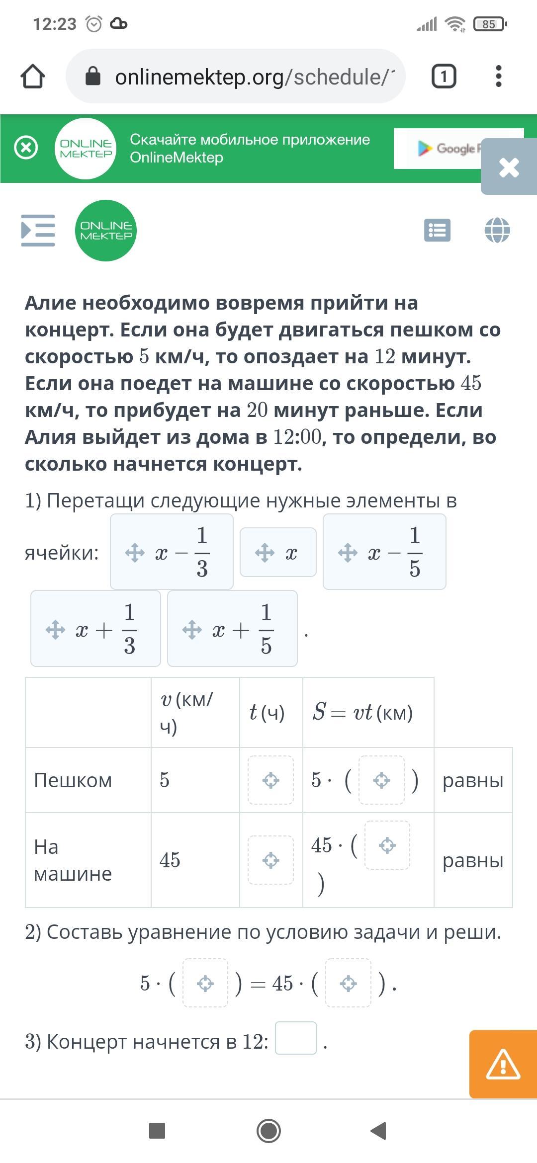 Алие необходимо вовремя прийти на концерт. Если она будет двигаться пешком со скоростью 5 км/ч, то опоздает на 12 минут. Если она поедет на машине со скоростью 45 км/ч, то прибудет на 20 минут раньше. Если Алия выйдет из дома в 12:00, то определи, во сколько начнется концерт.